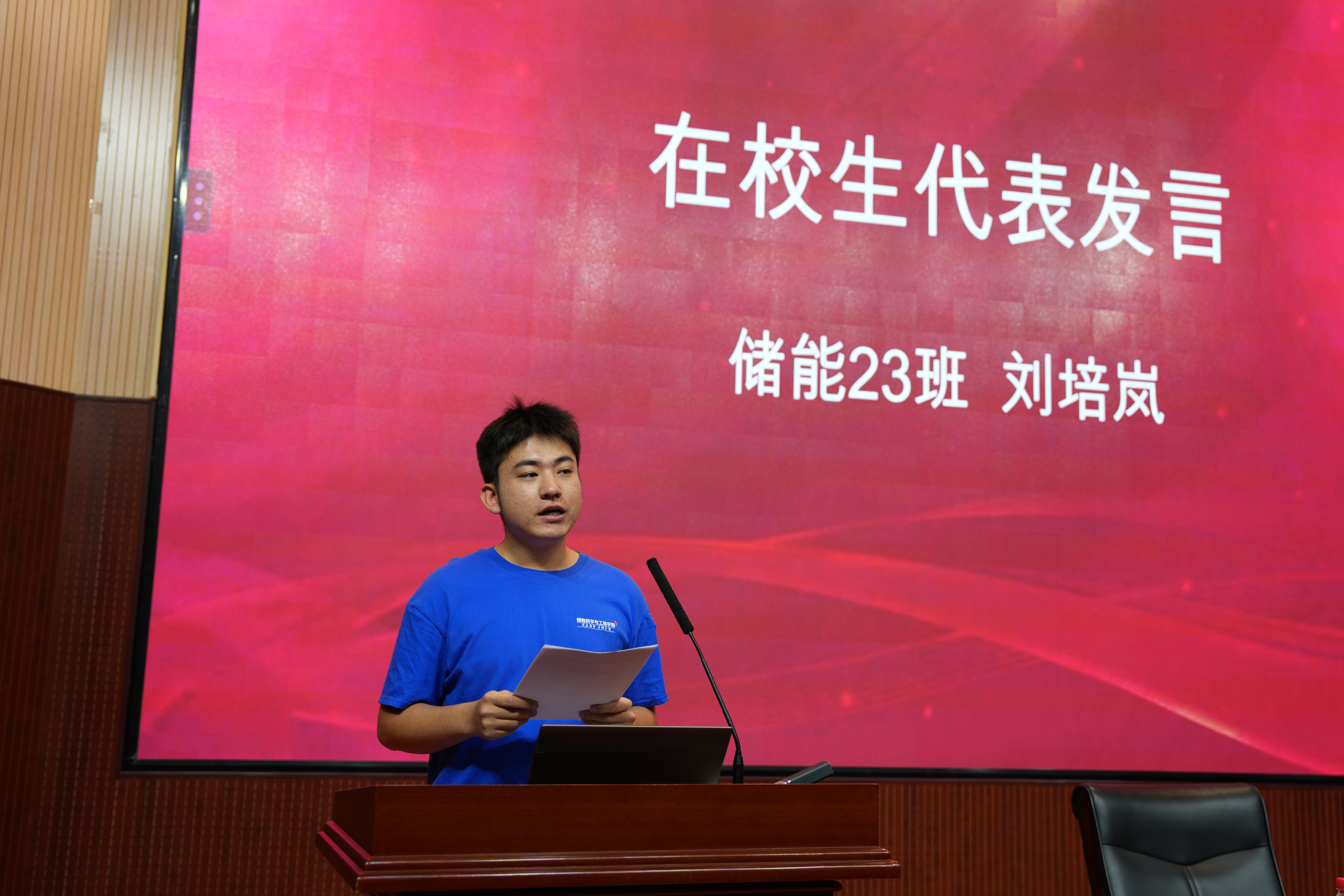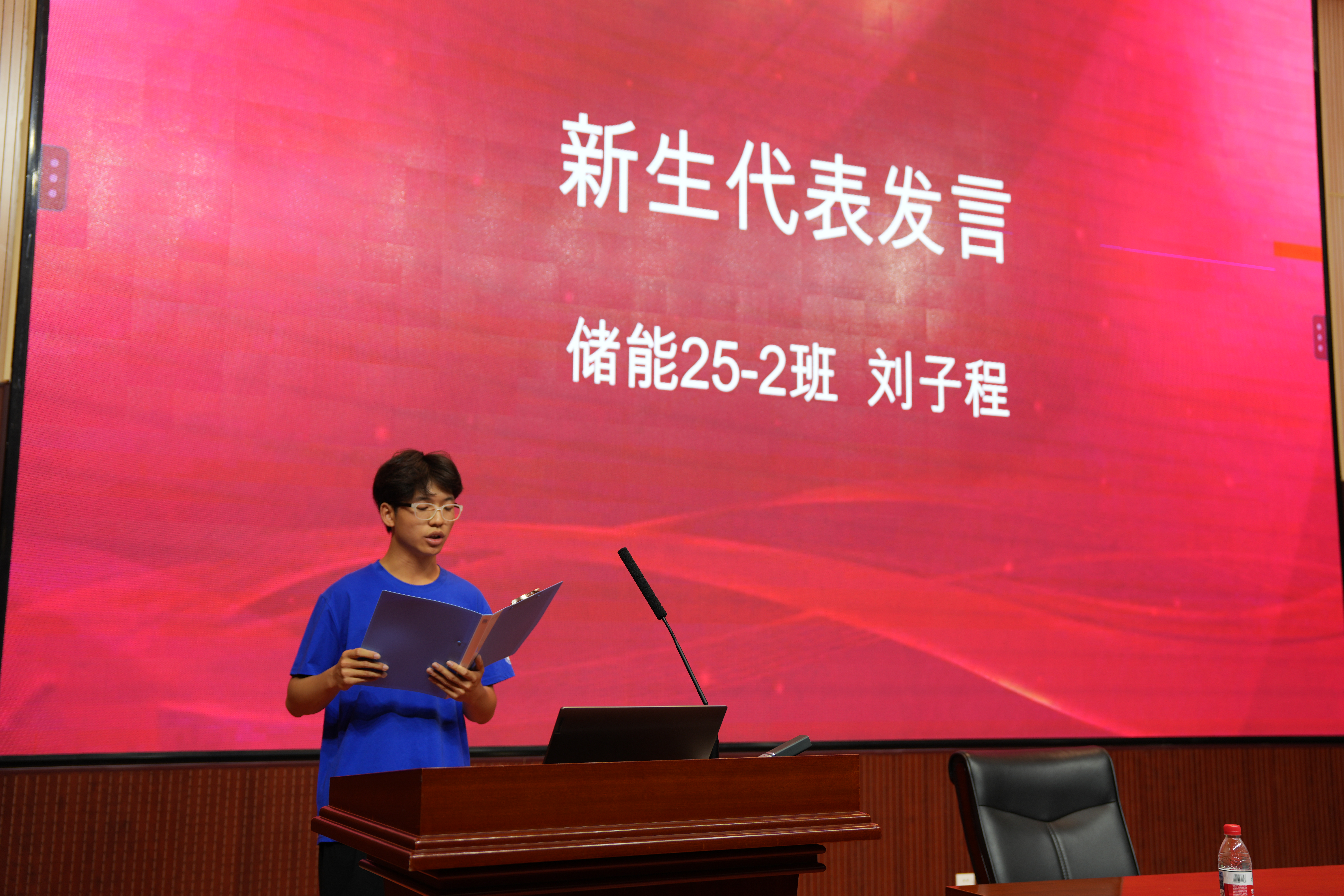 新生代表、储能25-2班刘子程同学分享了对大学生活的期待与对储能专业的初识,表达了将个人理想融入国家“双碳”战略的决心。在校生代表、储能23班刘培岚同学分享了他的学习体会与成长感悟,结合暑期参与纪念中国人民抗日战争暨世界反法西斯战争胜利80周年志愿服务的经历,勉励新生将个人成长融入时代使命,夯实基础、勇于实践,以专业所学践行“兴工报国”的担当。教师代表辛永琳老师代表全院教师向新生致以热烈欢迎,她寄语同学们要尽快转变角色,学会自主学习和深度思考,将个人成长融入国家发展,在储能学院度过充实而精彩的青春时光。